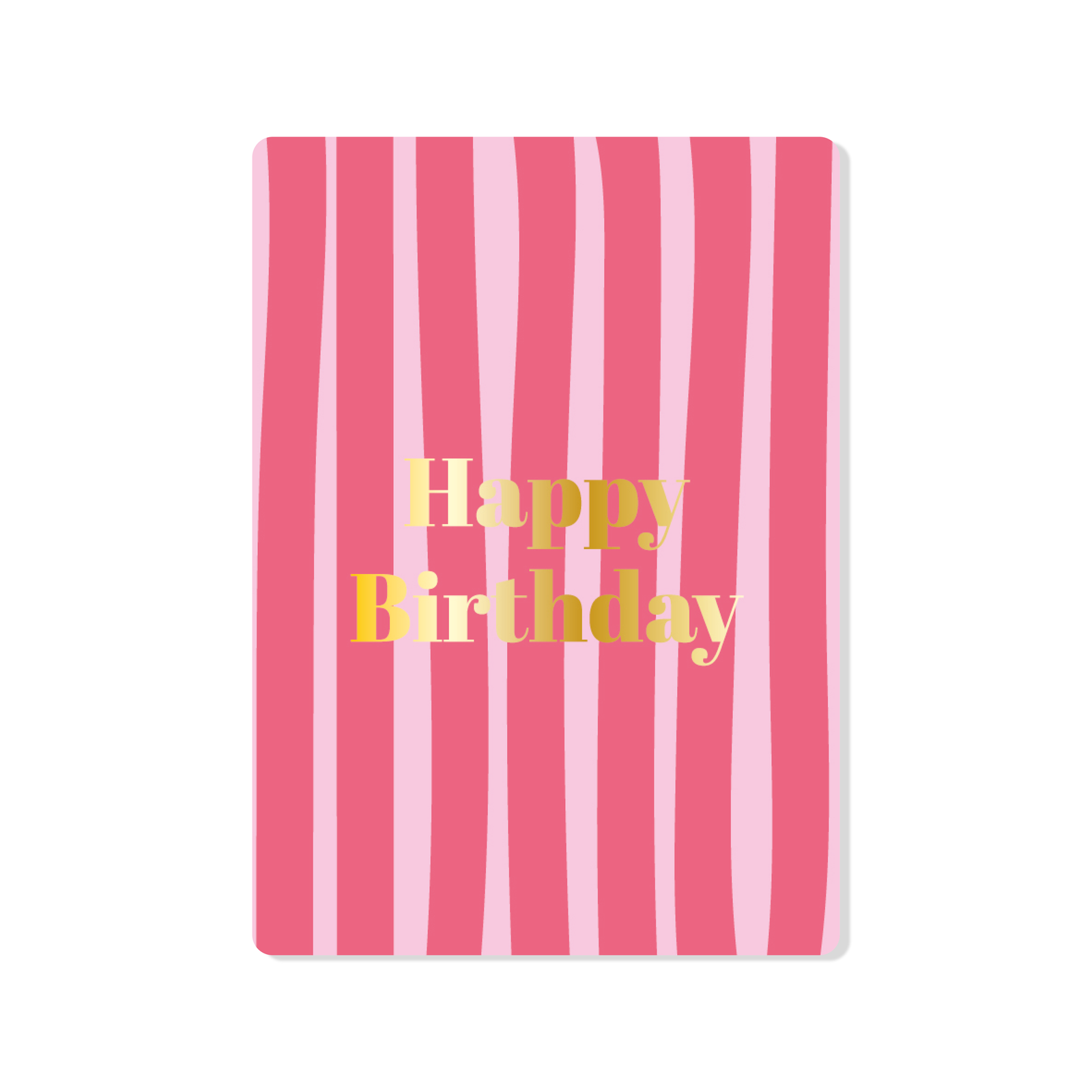 Op zoek naar een feestelijk kaartje om iemand te verrassen op zijn of haar verjaardag? Dit stijlvolle ansichtkaartje met lichte en felroze strepen en de elegante “Happy Birthday” tekst in goudfolie straalt één en al vrolijkheid uit! De speelse, maar luxe uitstraling maakt dit kaartje perfect voor jong en oud.