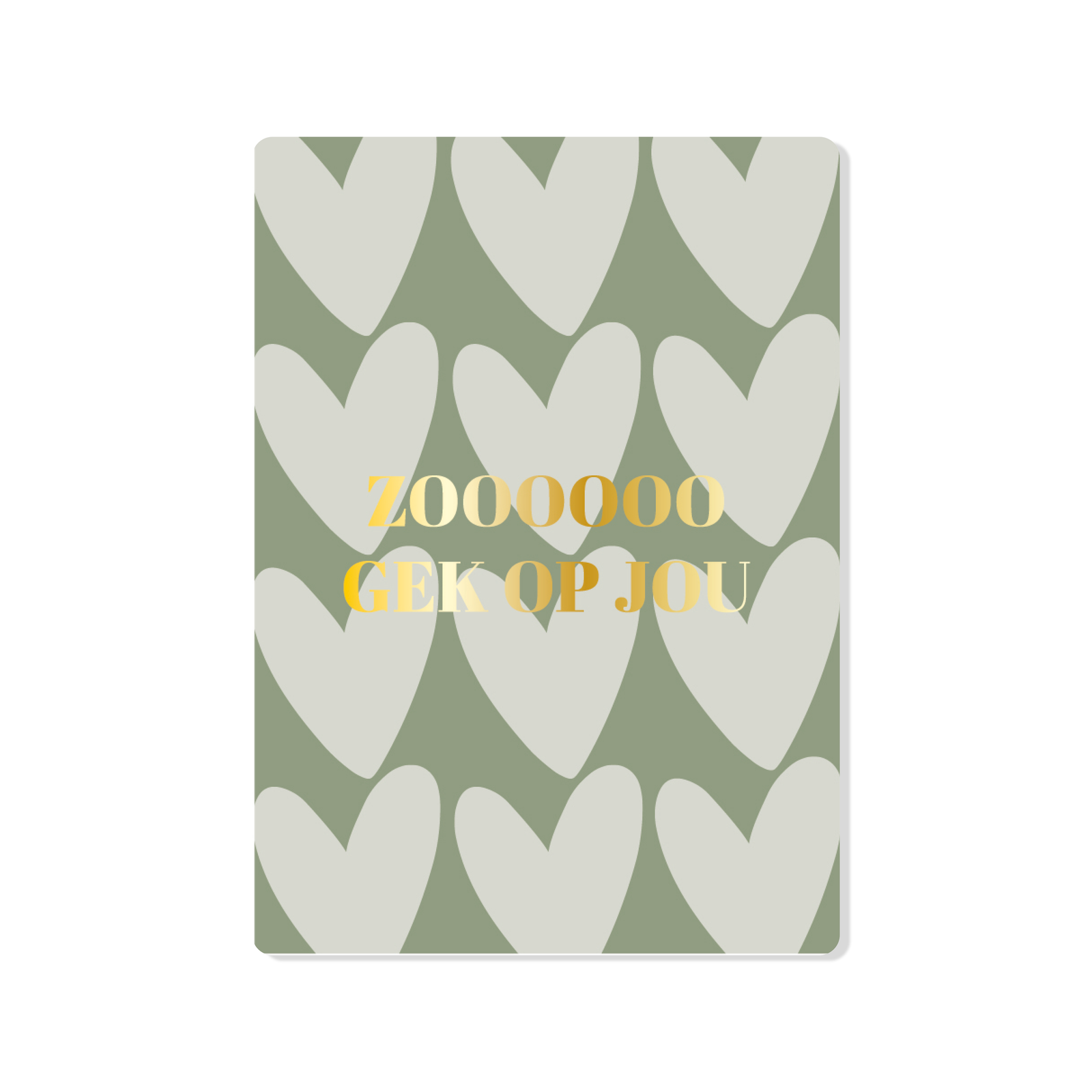 Deze frisse groene kaart zegt precies wat je voelt, op een speelse én stijlvolle manier. De tekst zooooo gek op jou is uitgevoerd in glanzende goudfolie, wat het kaartje een sprankelend accent geeft. Perfect om iemand te laten weten hoeveel je om diegene geeft, of het nu je partner, je beste vriend(in) of een familielid is.