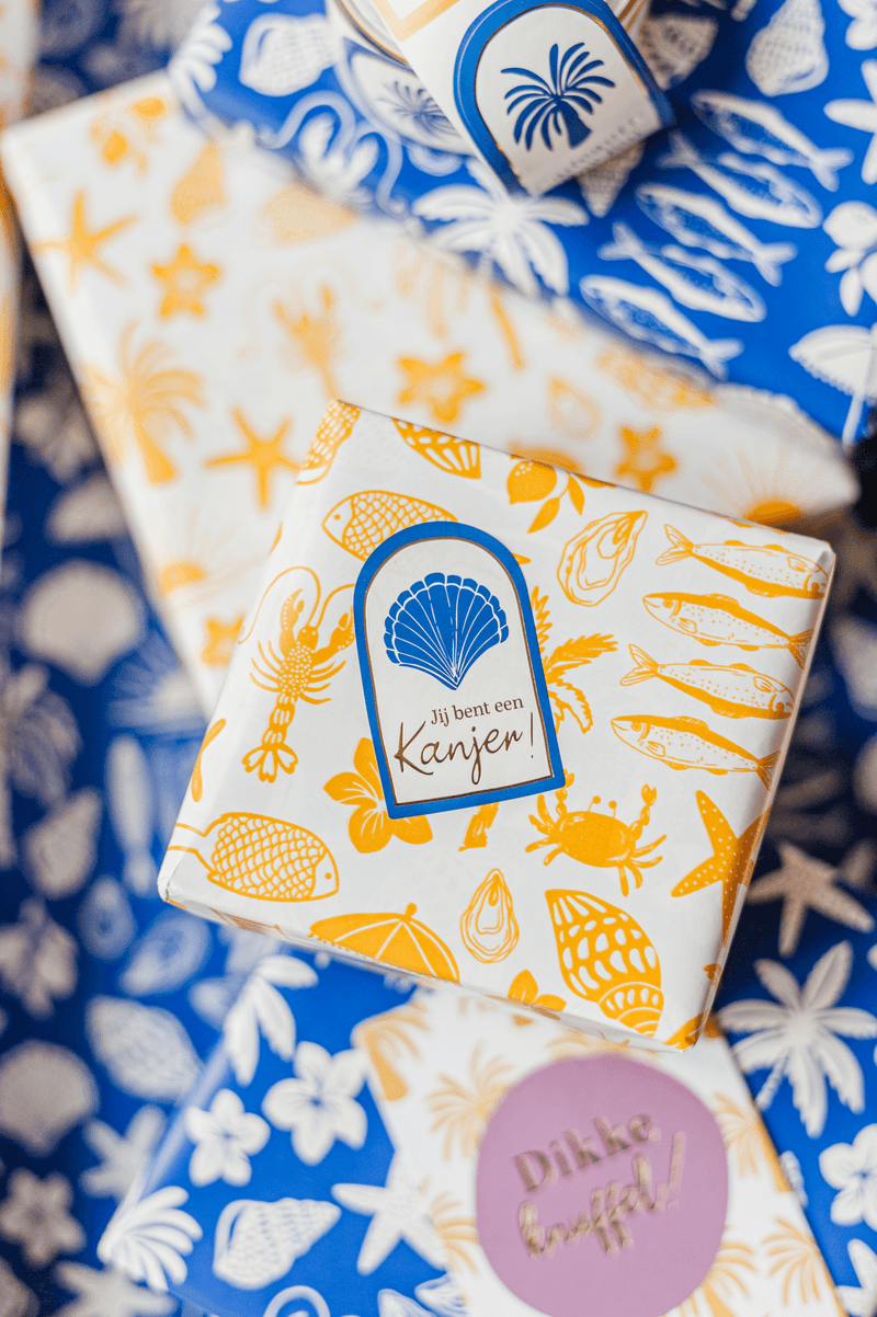Of het nu een klein cadeautje is of een groter pakketje, met dit papier wordt het inpakken een feestje. Zomers, vrolijk en net even anders, en helemaal klaar om te combineren met een kaartje of lint.