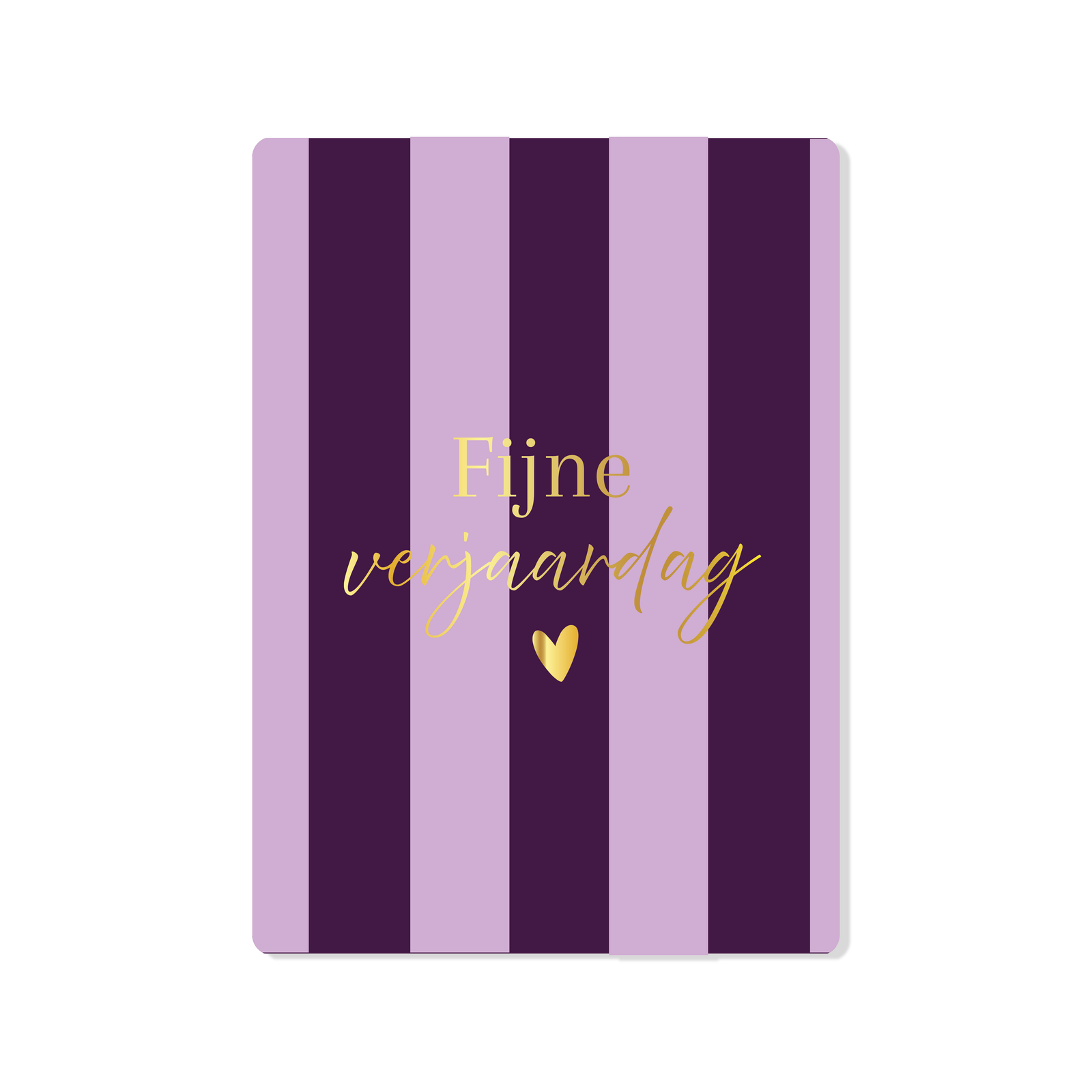 Een stijlvolle verjaardagskaart in lila en paarse strepen met de tekst Fijne Verjaardag in goud en een subtiel hartje, een mooie keuze voor een feestelijke en verfijnde felicitatie.