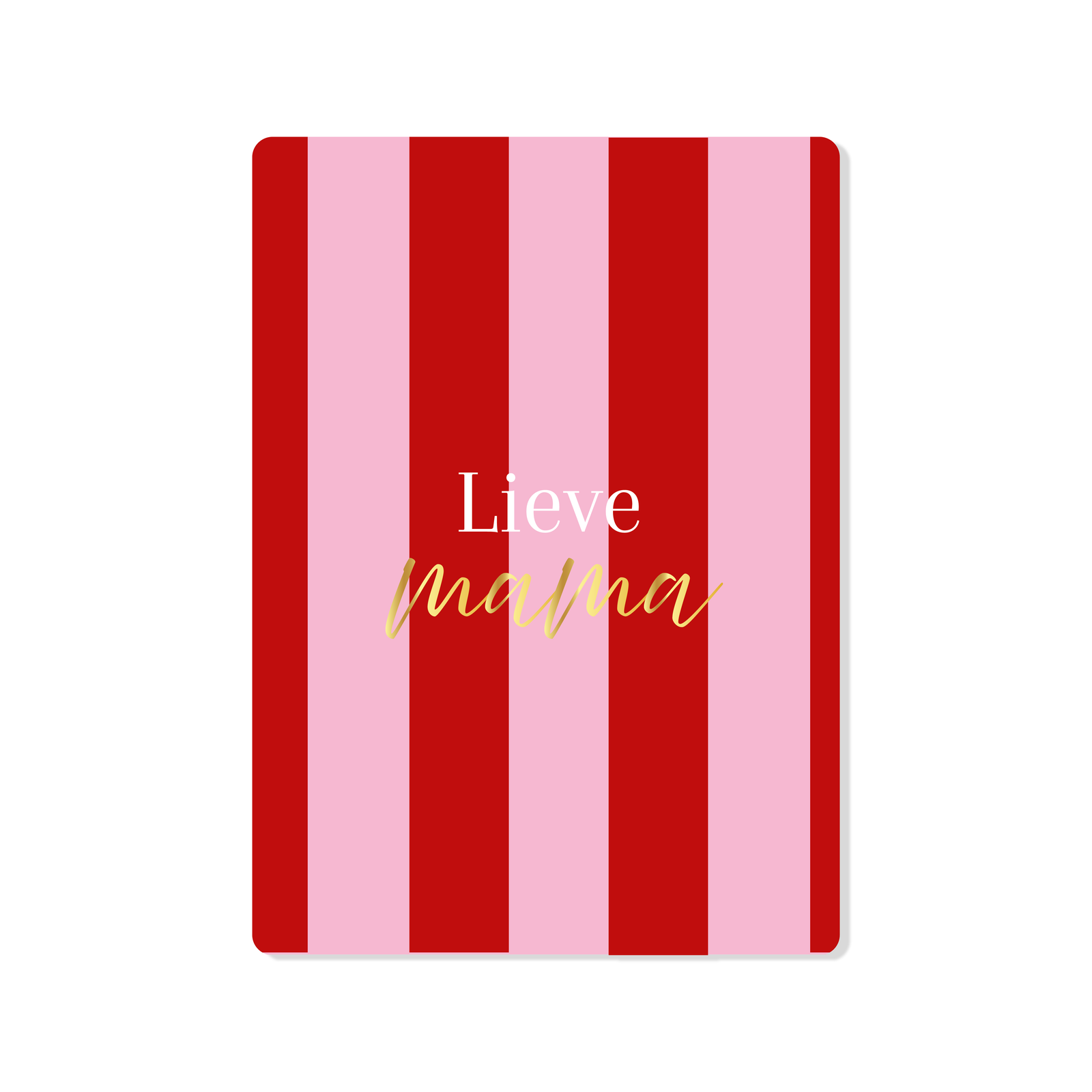 Een stijlvolle kaart in roze en rood gestreept design met de tekst Lieve Mama, perfect om haar op een warme en persoonlijke manier te verrassen.
