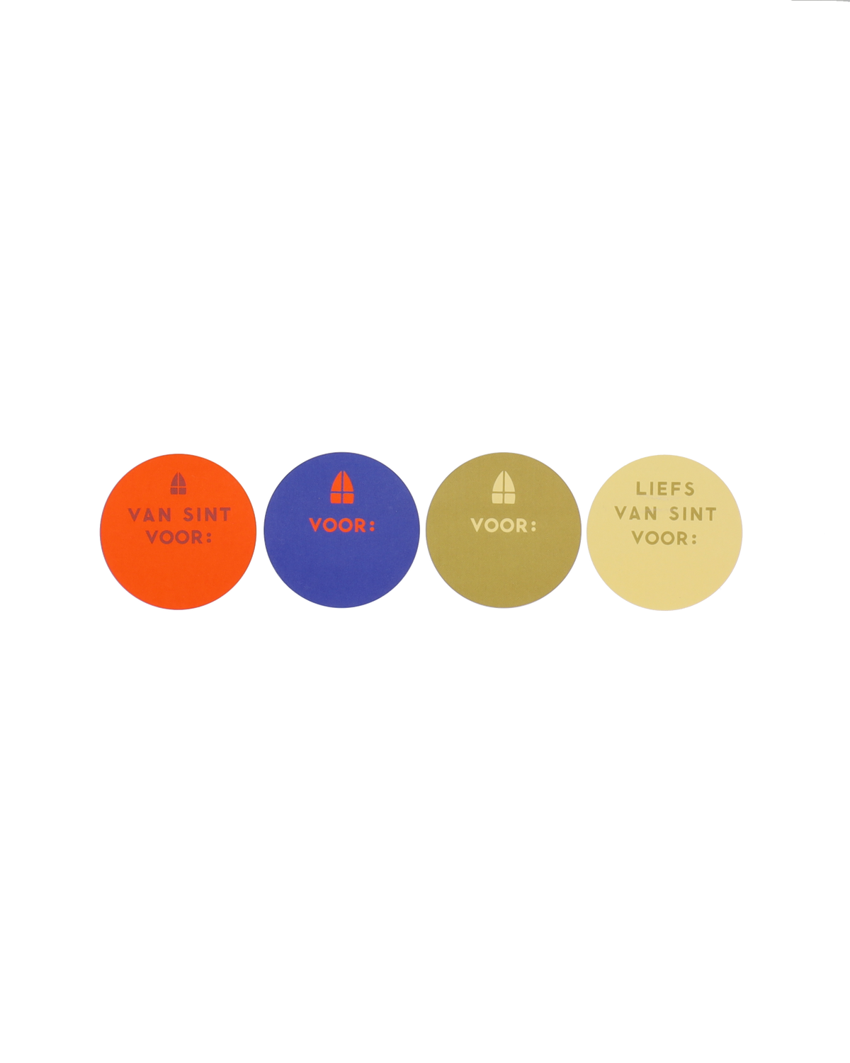 Deze vrolijke stickers leuken elk cadeautje op, vier verschillende kleuren. Een set bestaat acht stickers, dus elk design ontvang je twee keer, de stickers zijn rond en hebben een diameter van 50 mm.